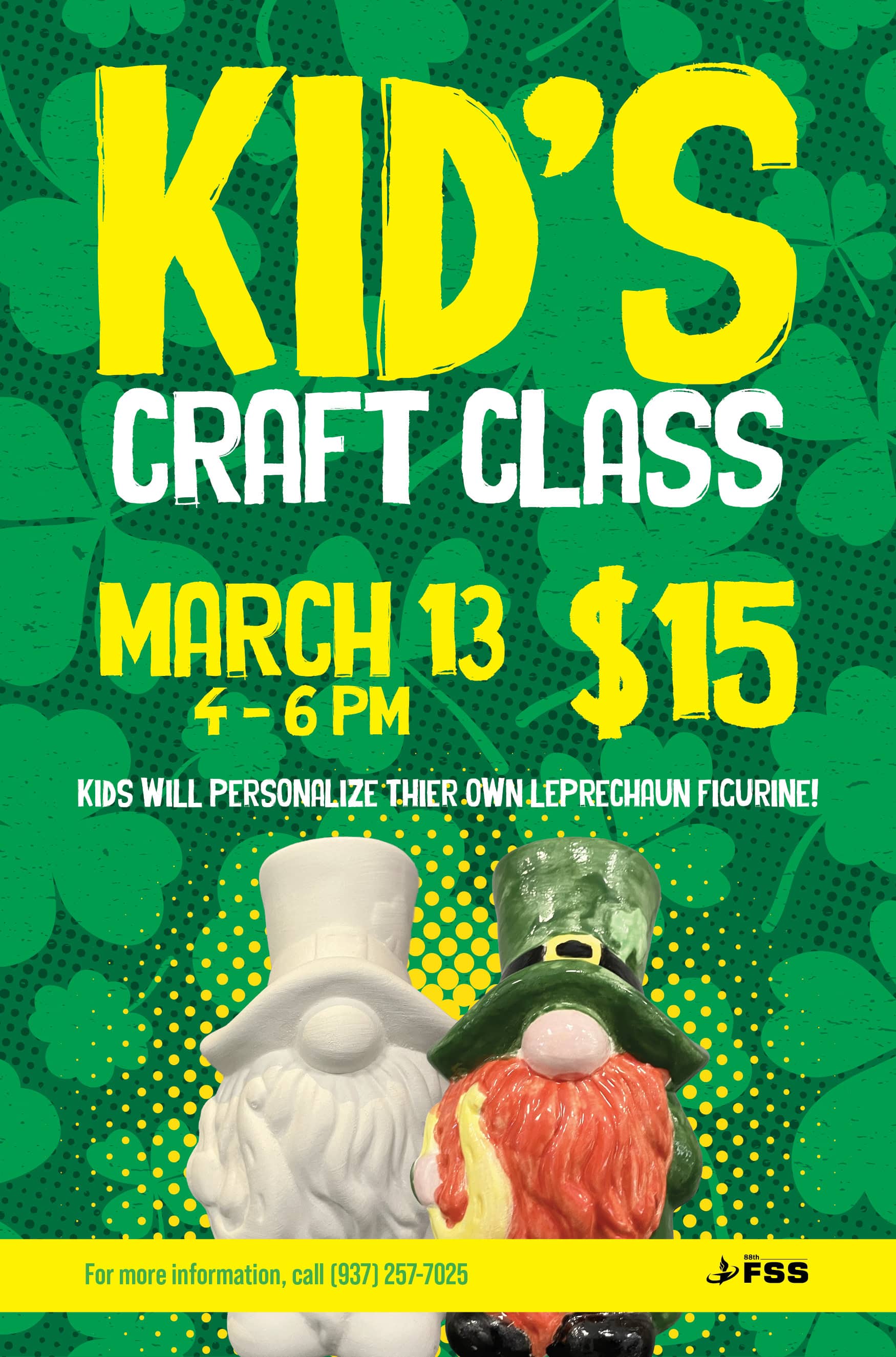 What: Kids will paint their own leprechaun figurine which will then be glazed and fired in the new kiln! Cost is $15, call 937-257-7025 to register.